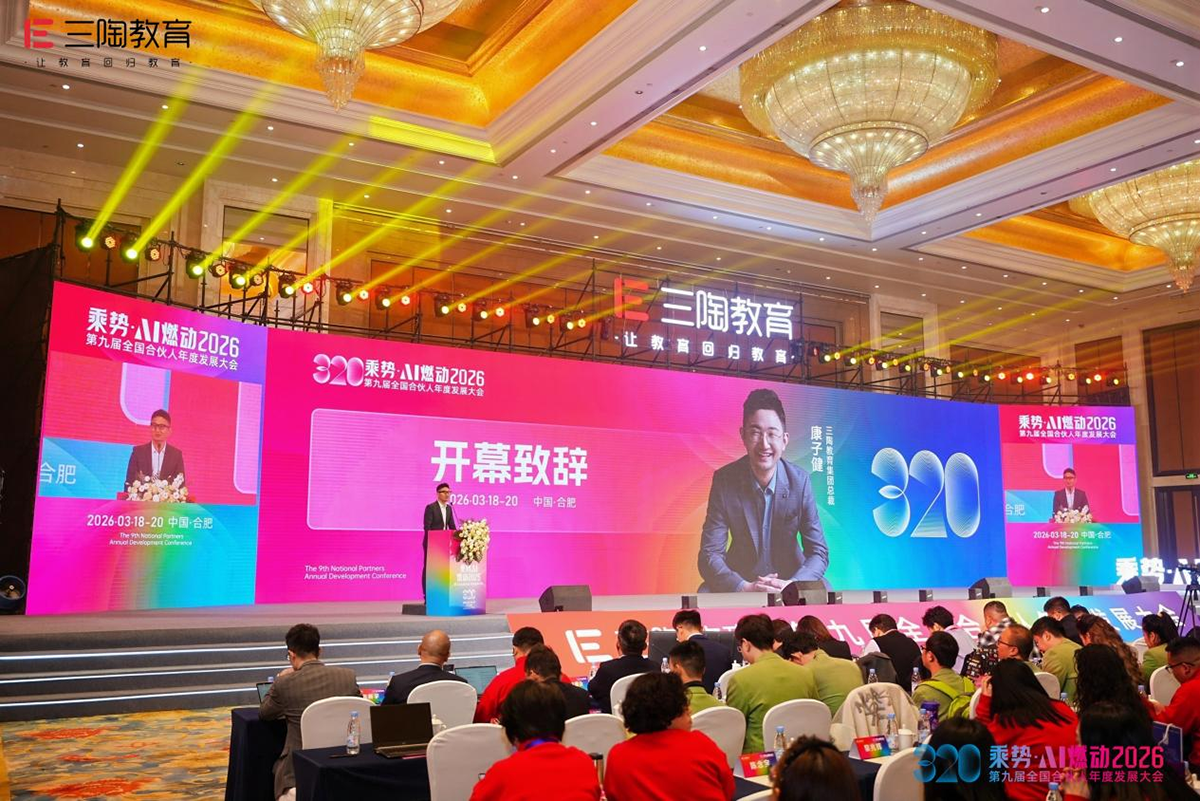 2026年3月18日至20日,以“乘势·AI燃动2026”为主题的三陶教育第九届全国合伙人年度发展大会在合肥盛大启幕。千余位合伙人、高校代表、AI教育专家及行业嘉宾齐聚“大湖名城、创新高地”,共同见证三陶教育在AI时代的新战略布局与新程启航。三天议程紧凑而充实,重磅发布与战略签约轮番登场,全景式勾勒出AI赋能教育的发展蓝图,也为全国合伙人注入了持续前行的信心与动能。