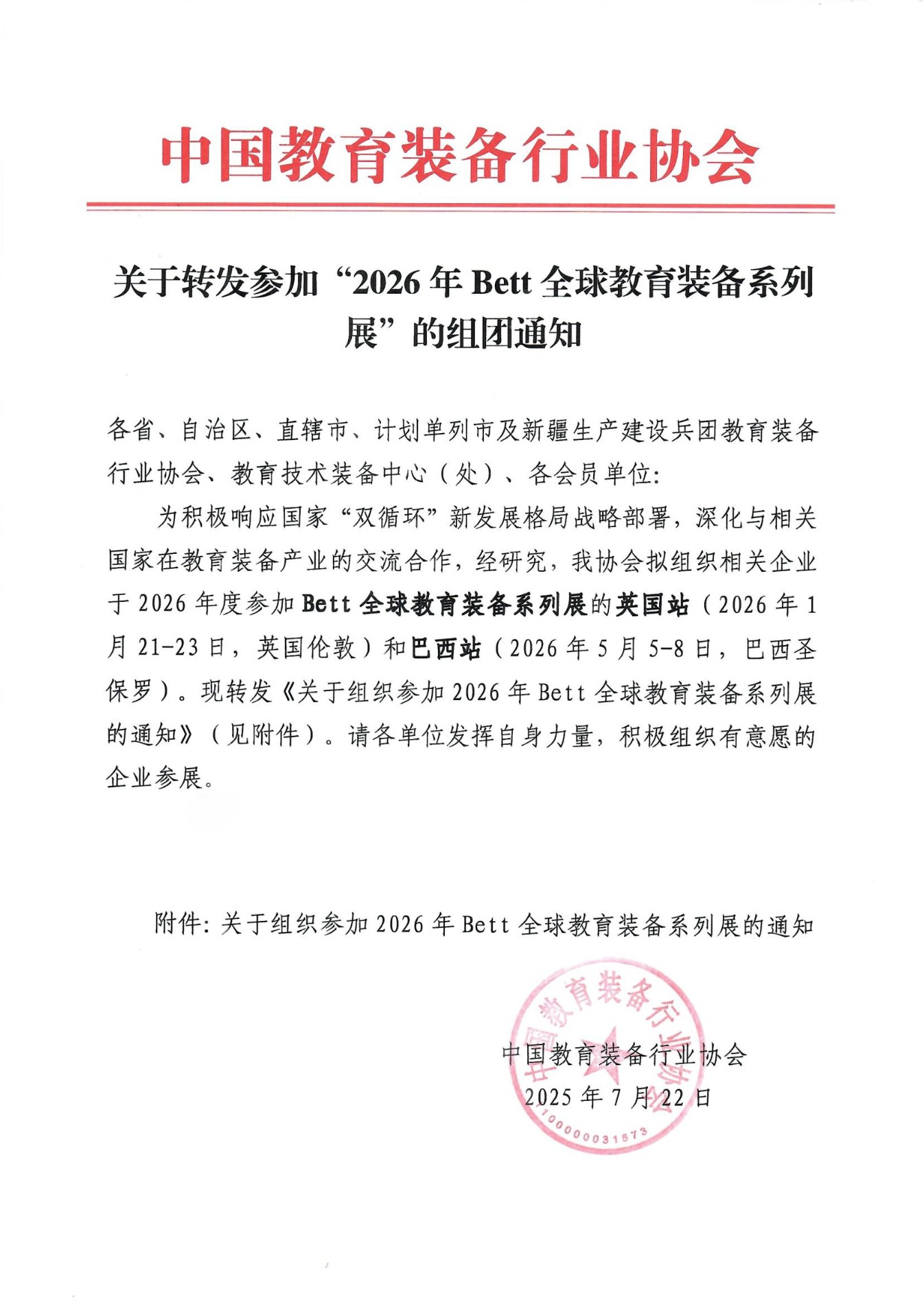 关于转发参加“2026年Bett全球教育装备系列展”的组团通知